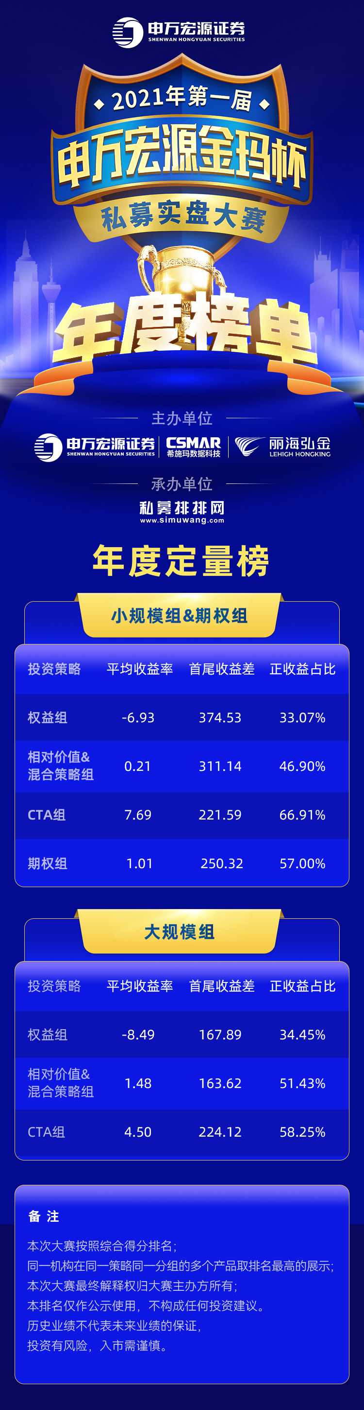 本次大赛的年度奖项、特色奖项是根据大赛公示的定量和定性规则,按照综合得分进行排名,该排名主要是对管理人在大赛期间内的表现进行展示,不代表本公司对私募管理人和私募产品的推介。